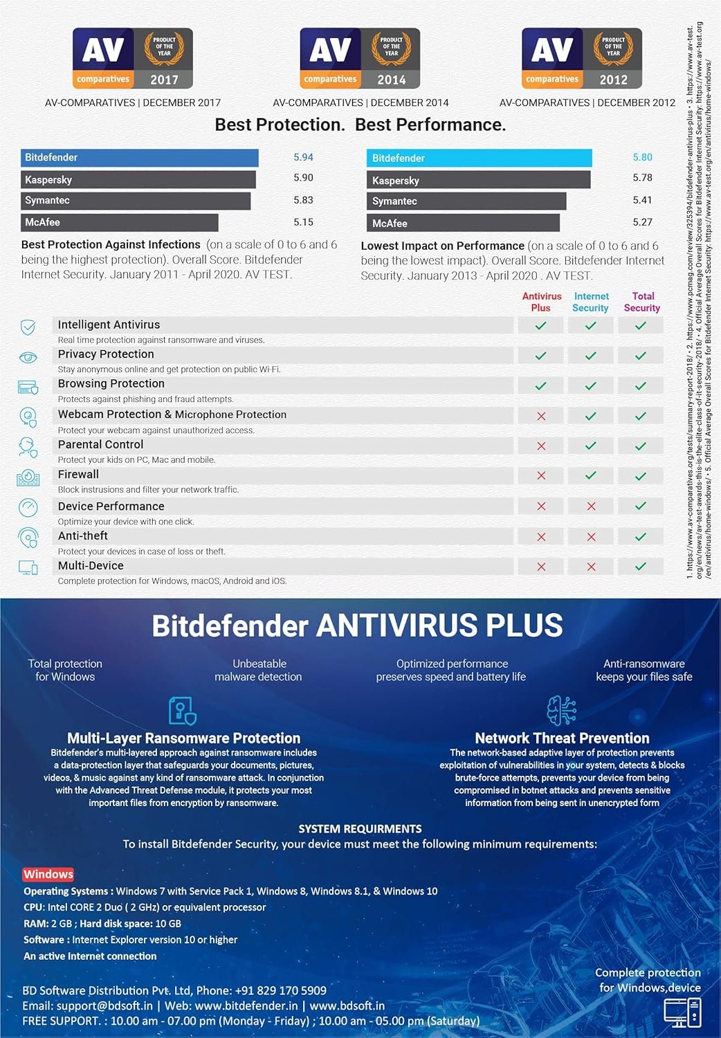 Antivirus, Anti-Phishing, Anti-Fraud, Complete and Real-Time Data Protection, Network Threat Prevention, Advanced Threat Defense, Multi-Layer Ransomware Protection, Vulnerability Assessment, Web Attack Prevention, Autopilot, Bitdefender Photon, Global Protective Network, Game, Movie and Work Modes, Battery Mode