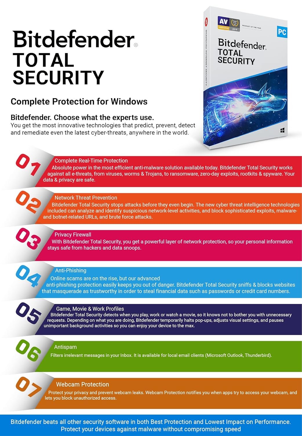 Antivirus, Anti-Phishing, Anti-Fraud, Antispam, Complete Real-Time Data Protection, Network Threat Prevention, Advanced Threat Defense, Multi-Layer Ransomware Protection, Vulnerability Assessment, Web Attack Prevention, Rescue Environment, Game, Movie and Work Modes, Speed Up Your Devices, Battery Mode, Global Protective Network