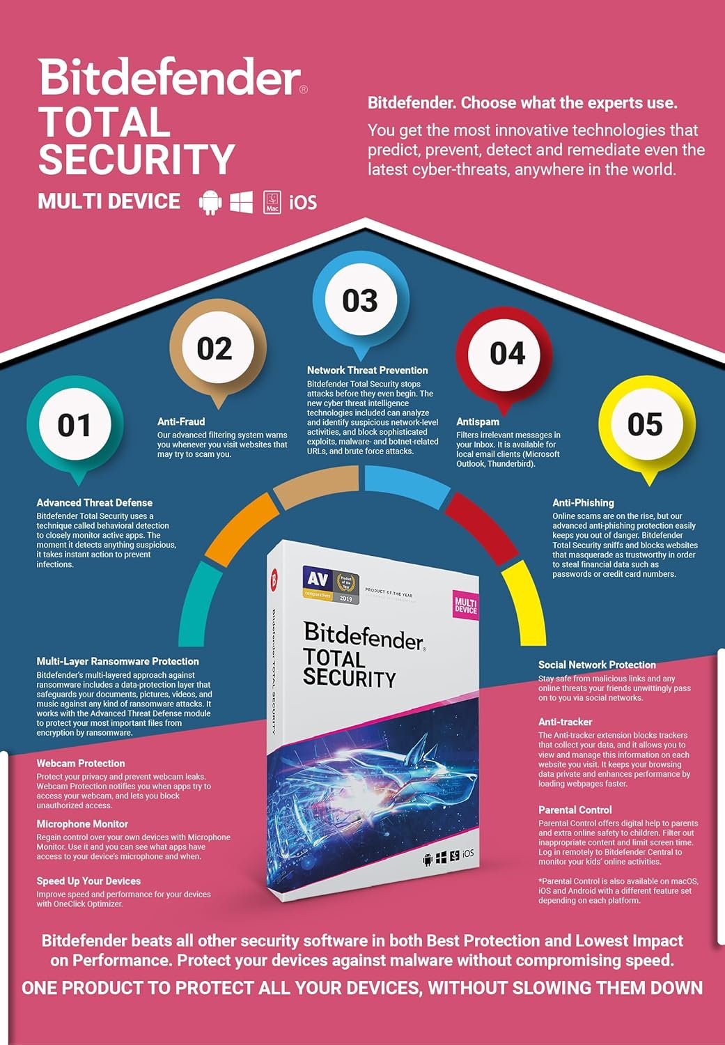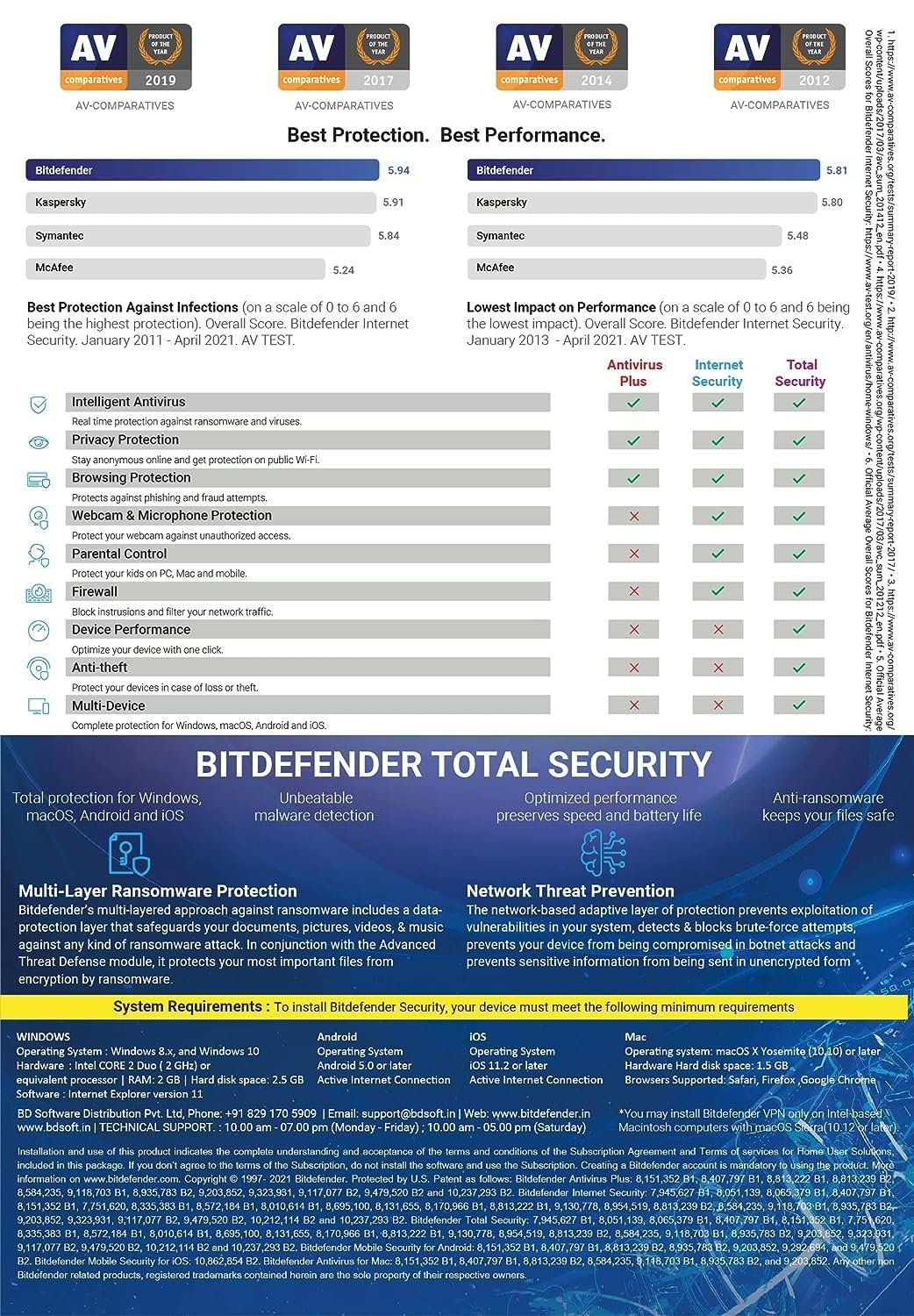 Antivirus, Anti-Phishing, Anti-Fraud, Antispam, Complete Real-Time Data Protection, Network Threat Prevention, Advanced Threat Defense, Multi-Layer Ransomware Protection, Vulnerability Assessment, Web Attack Prevention, Rescue Environment, Game, Movie and Work Modes, Speed Up Your Devices, Battery Mode, Global Protective Network