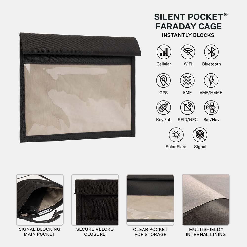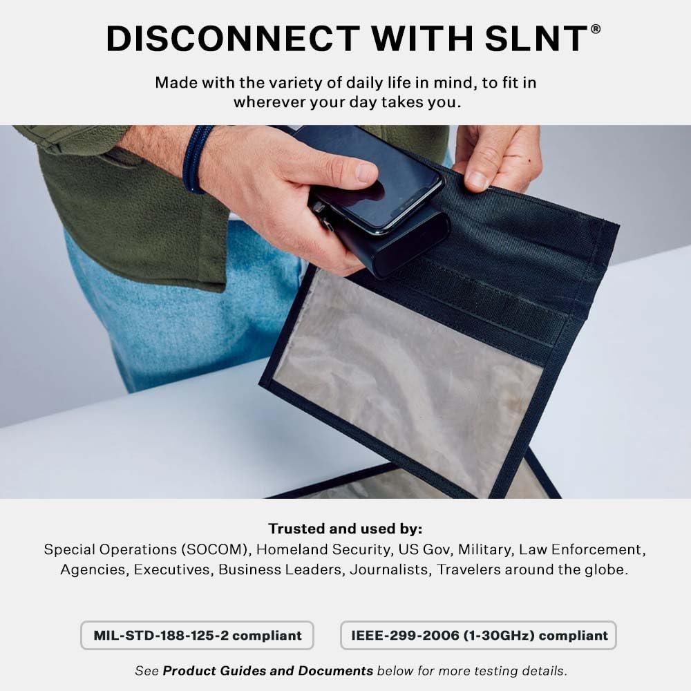 INSTANTLY BLOCKS ALL WIRELESS SIGNAL: Block all Cellular, GPS, WiFi, Bluetooth, RFID and NFC to your mobile device with the SLNT Window Faraday Cage bag. Made with durable, weatherproof polyester and our internal patented multishield Faraday material to give your device the most valuable physical and wireless protection.
