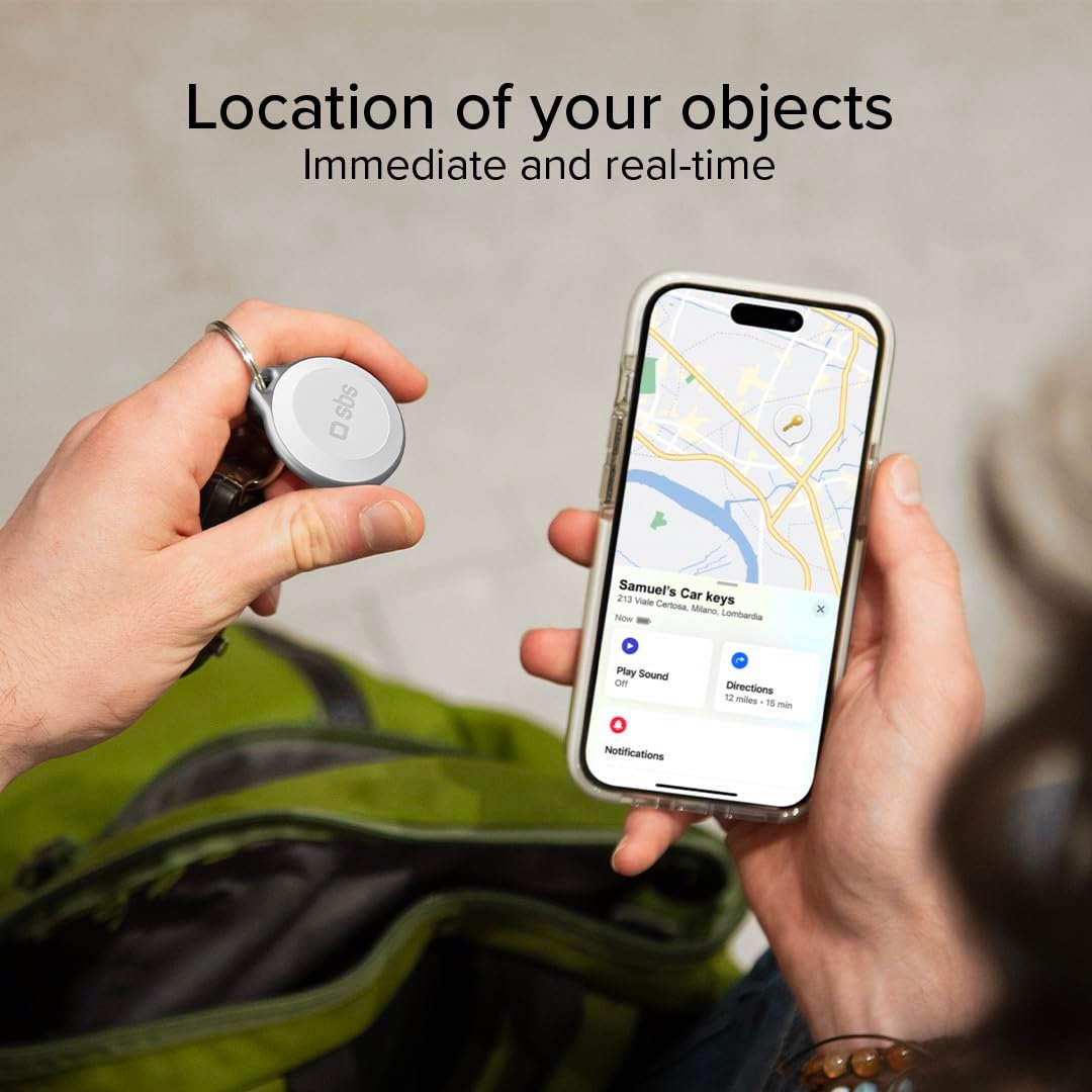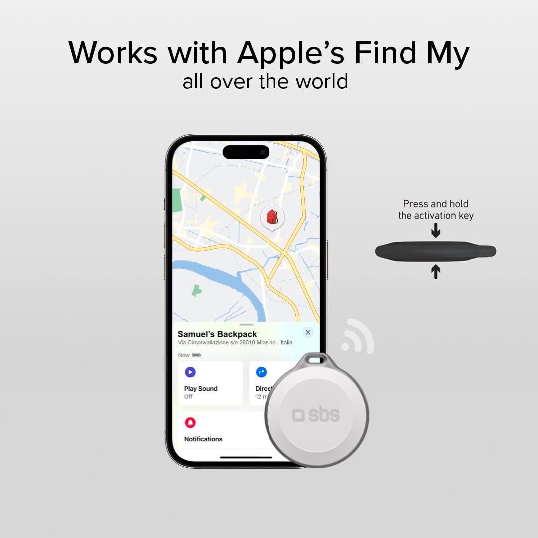The SBS Tracker is a tracking device compatible with Apple Find My technology, designed to help locate lost items like keys, bags, or bicycles. Instantly ready for use, it integrates seamlessly with the Apple Find My app and features a powerful 90–100 dB sound audible up to 50 meters.